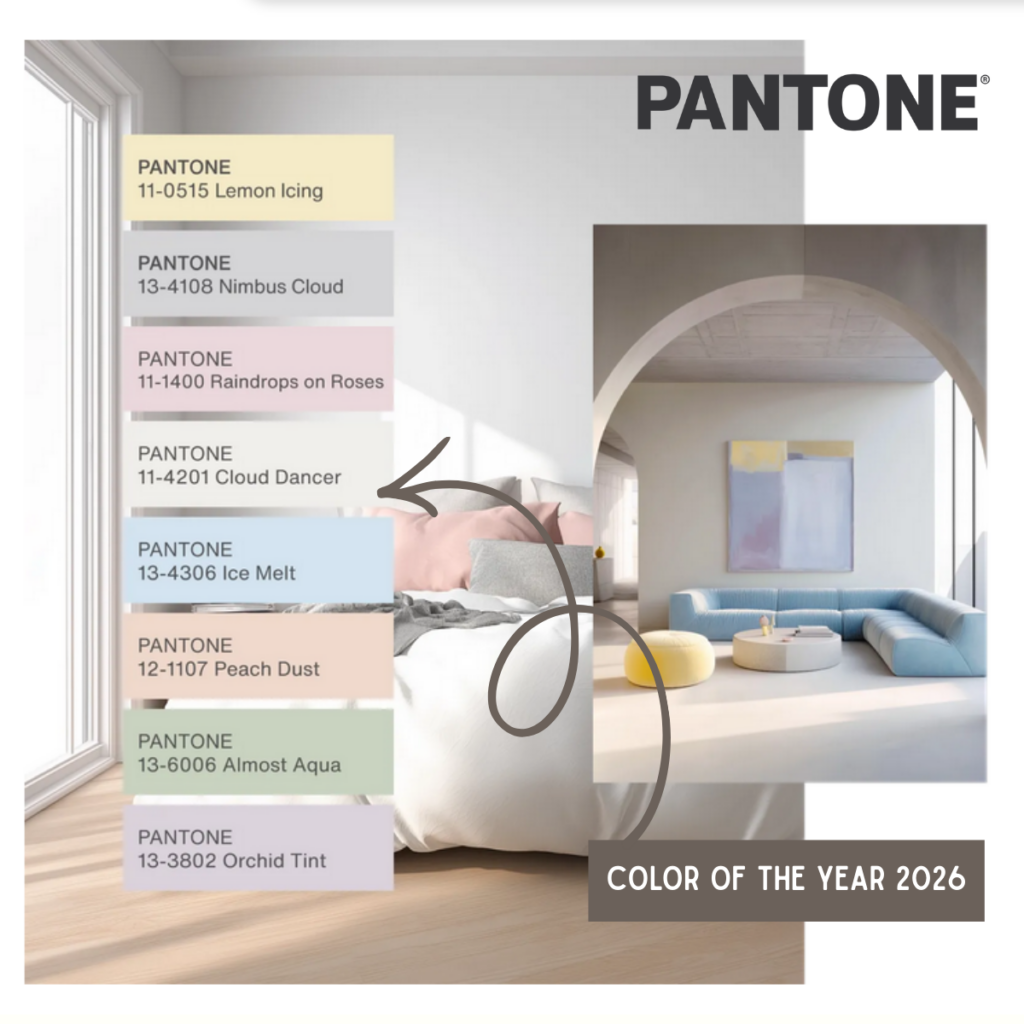 Avec Cloud Dancer, on entre dans un univers encore plus doux engagé ces dernières années. Depuis 2016, on était sur des verts vifs, corail, magenta ou bleu profond. La rupture avait commencé en 2024 avec le Peach fuzz (couleur pêche douce) puis le Mocha mousse (marron glacé).